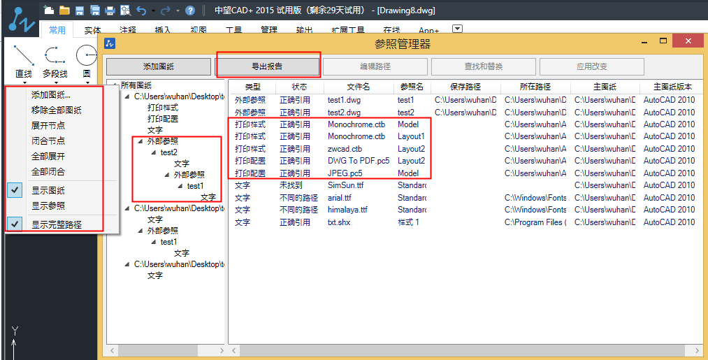 另一方面,中望CAD 2015 SP2在參照管理器功能上的提升也讓用戶對(duì)外來(lái)圖紙的圖形資源的管理更為高效。該版本的參照管理器增加了導(dǎo)出報(bào)告功能,軟件以.csv格式導(dǎo)出參照管理器中所顯示圖紙的相關(guān)內(nèi)容,如:類型、狀態(tài)、文件名等,并且在樹(shù)形結(jié)構(gòu)區(qū)域的節(jié)點(diǎn)中增加了右鍵菜單,方便用戶直接在參照管理器中對(duì)所打開(kāi)的圖紙進(jìn)行包括圖紙?zhí)砑?、參照及完整路徑顯示/關(guān)閉等一系列快捷操作,從而大幅度提升用戶處理大量參照的工作效率。
