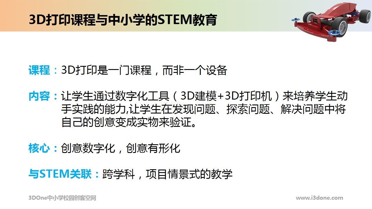 為此,i3DOne.com中小學(xué)三維創(chuàng)意社區(qū)特別邀請(qǐng)了高禮成老師,結(jié)合他對(duì)3D打印在教育領(lǐng)域的應(yīng)用研究,開設(shè)系列在線公開課,為老師科普中小學(xué)開展3D創(chuàng)意課的要點(diǎn)。其中本文節(jié)選了《中小學(xué)STEAM教育中的3D打印課程》這一課題的部分精華內(nèi)容,為老師們開展STEAM教育及3D創(chuàng)意課提供新的思路和啟發(fā)。