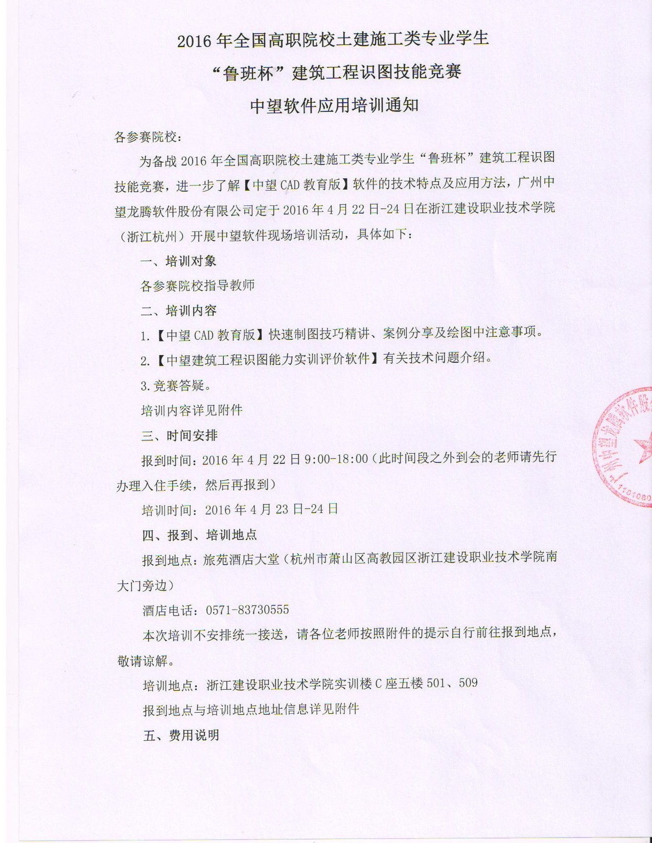 為備戰(zhàn)2016年全國高職院校土建施工類專業(yè)學(xué)生“魯班杯”建筑工程識圖技能競賽,進一步了解【中望CAD教育版】軟件的技術(shù)特點及應(yīng)用方法,廣州中望龍騰軟件股份有限公司定于2016年4月22日-24日在浙江建設(shè)職業(yè)技術(shù)學(xué)院(浙江杭州)開展中望軟件現(xiàn)場培訓(xùn)活動,具體如下: