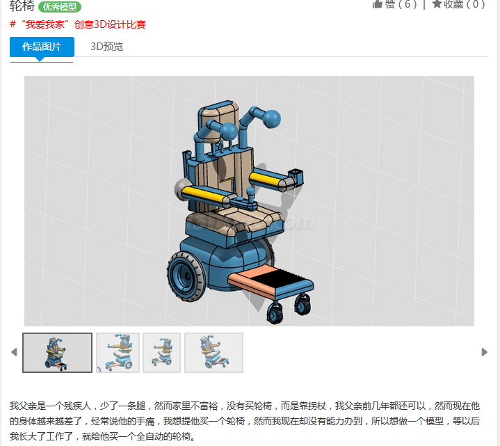 近日,主題為“未來汽車”的貴州省首屆青少年3D打印創(chuàng)意設(shè)計大賽在i3DOne青少年三維創(chuàng)意社區(qū)隆重舉行,同期社區(qū)也推出了“我愛我家”的3D設(shè)計比賽活動,得到了全國各地中小學(xué)生們踴躍參加。貴州的一個學(xué)生在參加“未來汽車”比賽之余,也參加了“我愛我家”活動,其發(fā)表的作品《輪椅》讓我很是感動,不但作品的設(shè)計水平讓人大為贊嘆,被我們的專業(yè)審核老師評為優(yōu)秀,并經(jīng)核實其背后的真實家庭故事尤其觸動人心。