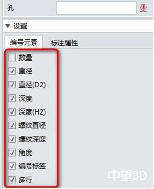 步驟三 :執(zhí)行孔標注功能。選擇需要對應的元素進行勾選,就可利用中望3D標注出相應的加工要求了。